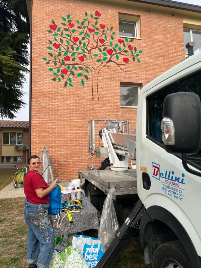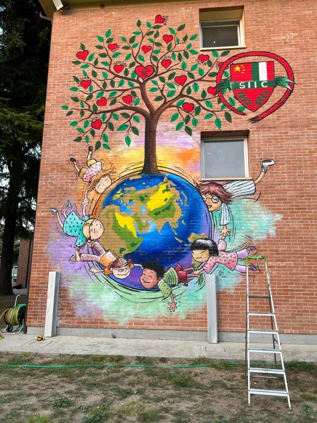 Questo murales è stato realizzato per una scuola italo-cinese a Padova, concepito per esprimere il legame di amicizia e collaborazione tra Italia e Cina. Questa opera, creata su una parete di mattoni, riflette i valori condivisi delle due culture attraverso colori e forme armoniose, coinvolgendo attivamente la comunità scolastica.