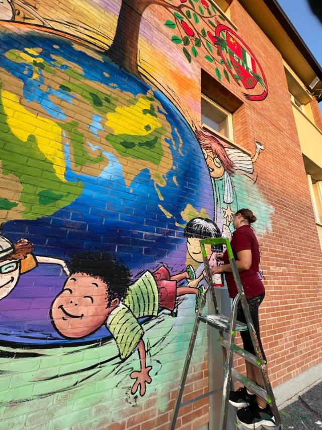 Abbiamo realizzato un murales dedicato all’unione e alla fratellanza tra i popoli su una parete esterna, utilizzando ponteggi pneumatici e rispettando tutte le normative di sicurezza. Per garantire la durabilità, abbiamo scelto colori acrilici resistenti agli agenti atmosferici, e la progettazione è stata attentamente supervisionata e approvata dalla dirigenza dell’istituto. Durante il processo, abbiamo accolto alcune modifiche richieste dal commissionante, implementandole senza impatti sul budget iniziale. Questo progetto celebra l’amicizia e la collaborazione tra culture diverse, evidenziando il nostro impegno a realizzare la visione dei nostri clienti.