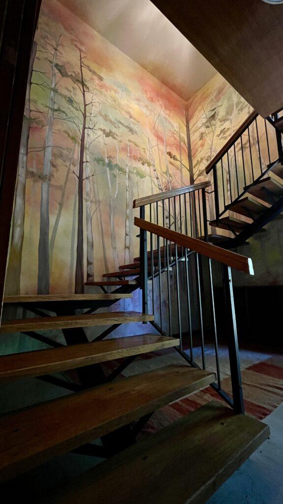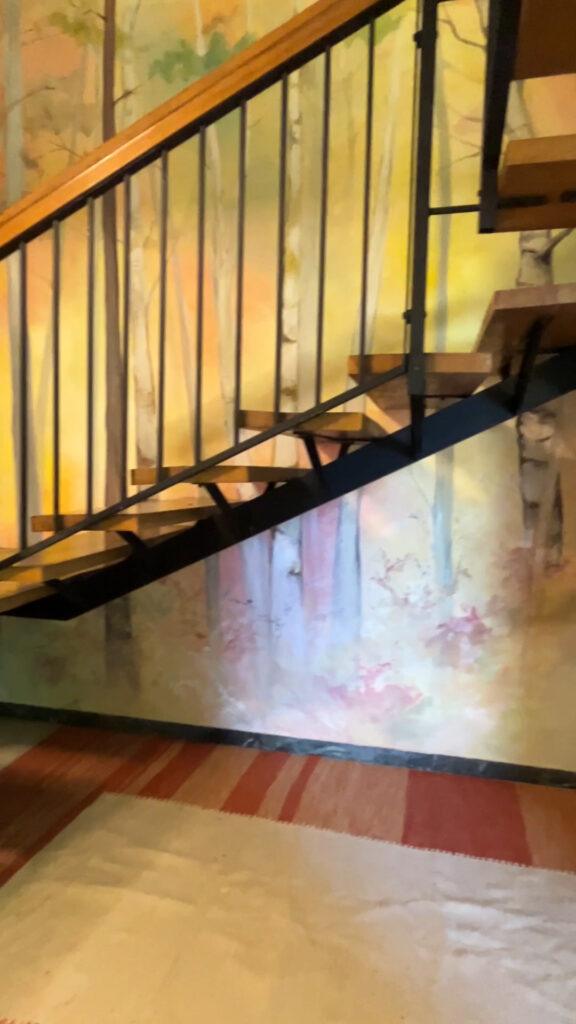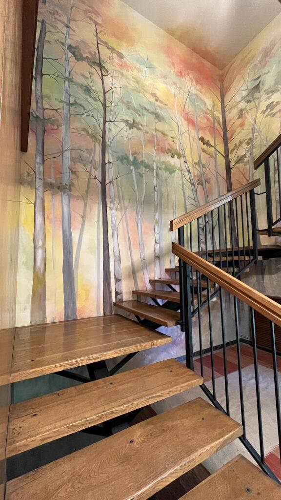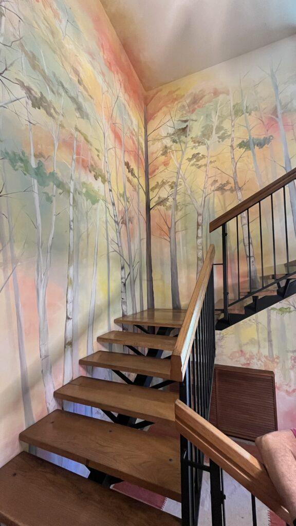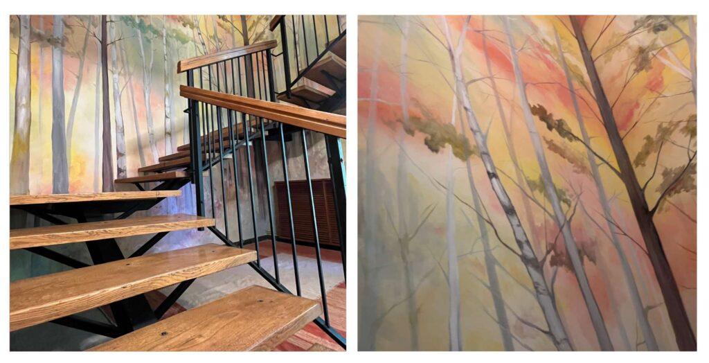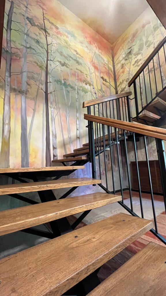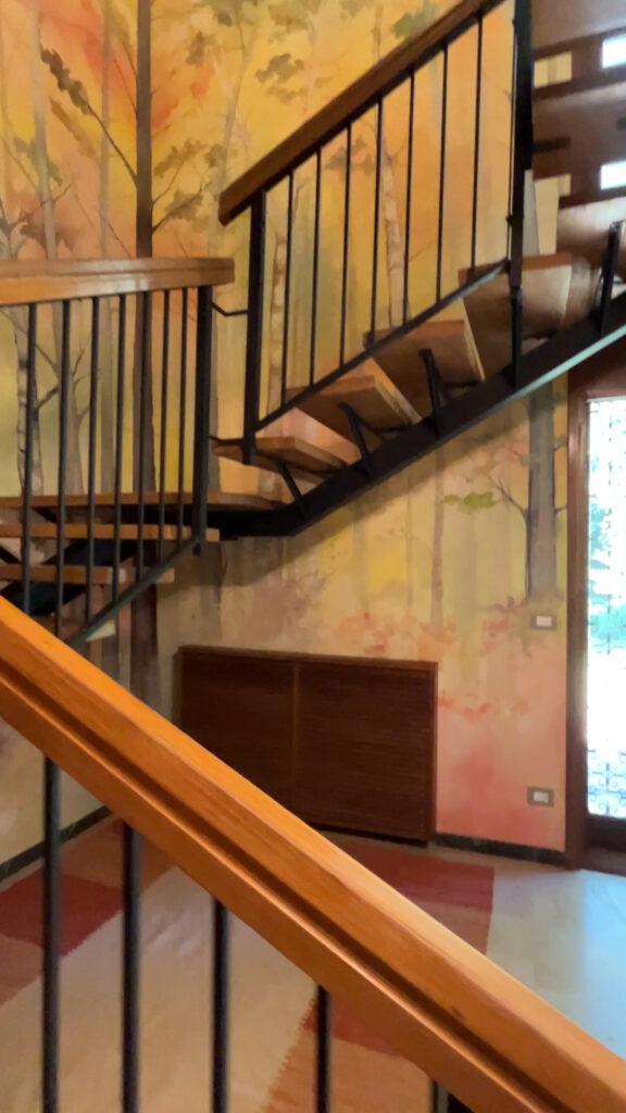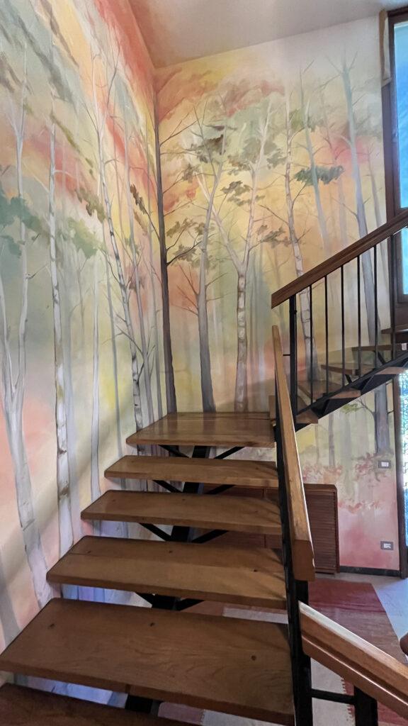 Il vano scala è uno degli spazi più complessi da decorare, soprattutto quando presenta pareti alte e ampie che possono risultare difficili da gestire. In una splendida villa a Monselice, un’ampia scala in legno con pareti molto alte richiedeva un intervento artistico per diventare il punto focale dell’ambiente. La soluzione scelta è stata quella di realizzare un murale verticale ispirato a un bosco, utilizzando uno stile acquerellato e una palette di colori pastello leggeri e luminosi. Questa scelta ha permesso di esaltare l’altezza dello spazio, rendendolo al contempo accogliente ed elegante.