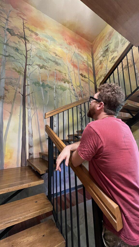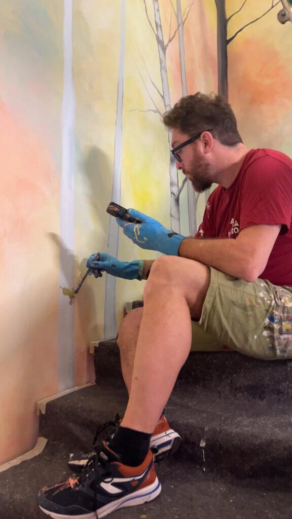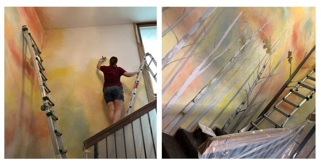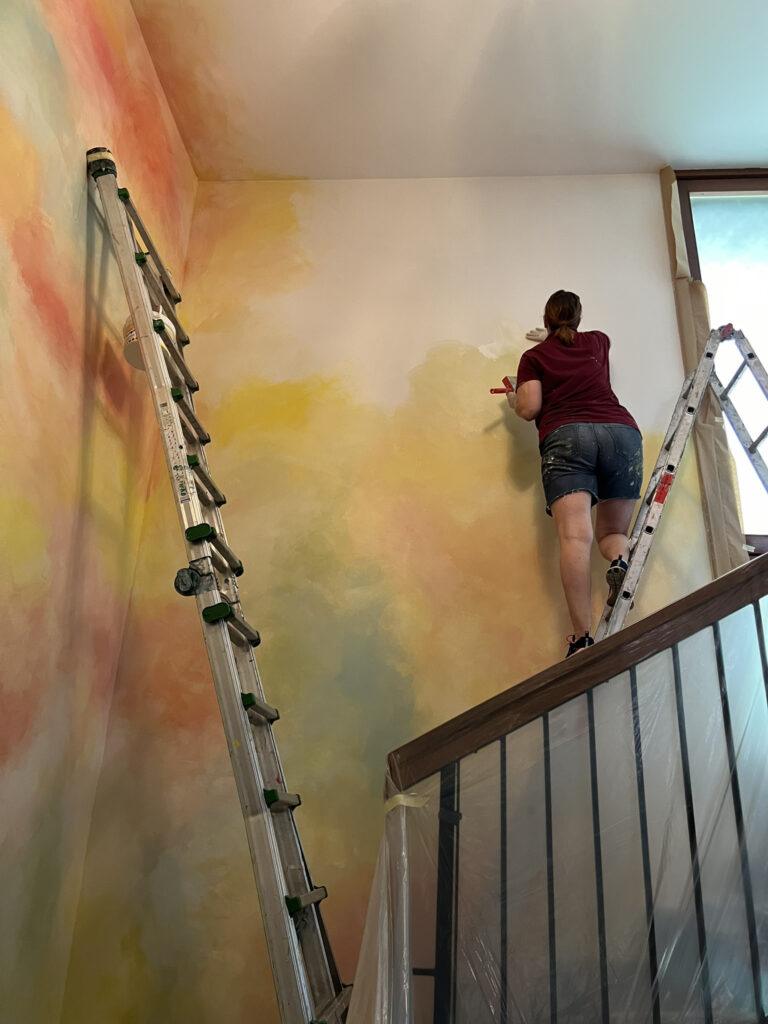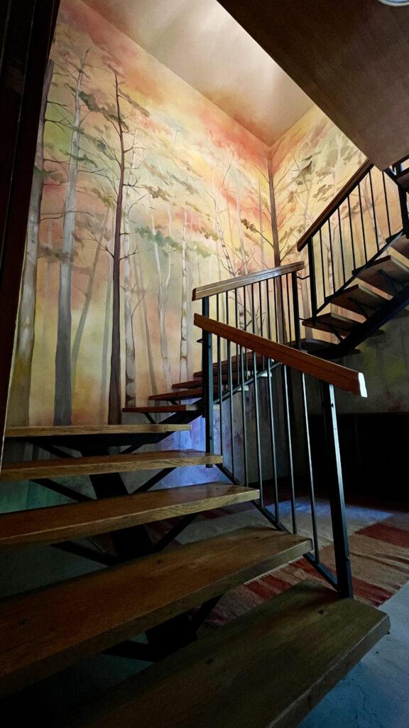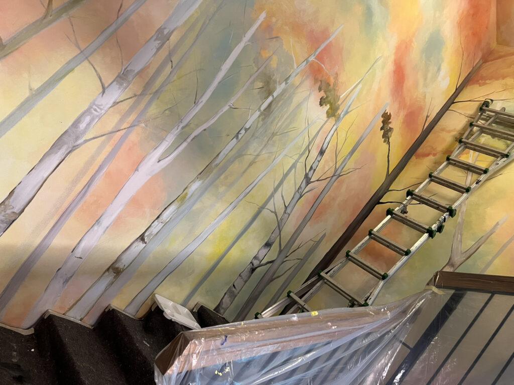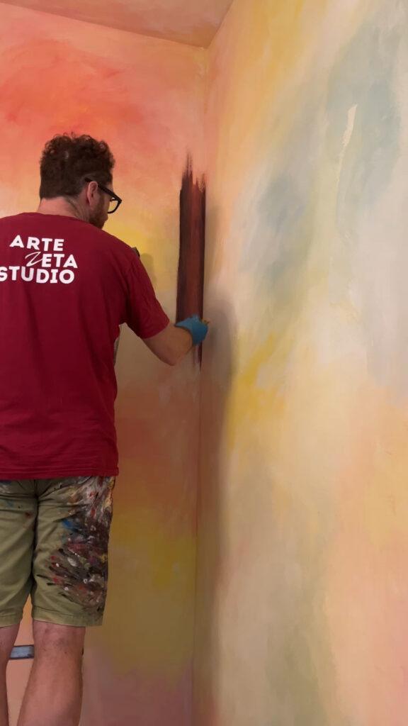 La principale difficoltà di lavorare in un vano scala è garantire l’accessibilità durante i lavori, poiché la scala rappresenta l’unico collegamento con il piano superiore. Per superare questo ostacolo, si è optato per l’uso di scale molto alte, evitando l’installazione di un’impalcatura, così da assicurare la fruibilità continua dello spazio per i clienti. L’effetto acquerello è stato ottenuto attraverso sovrapposizioni di velature di colori diluiti, che donano profondità e luminosità al murale.