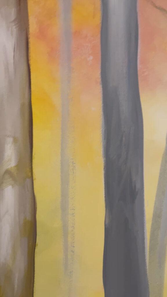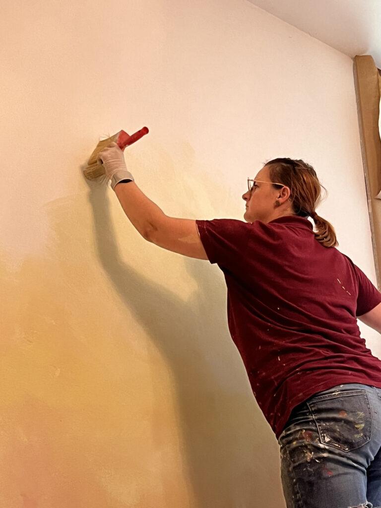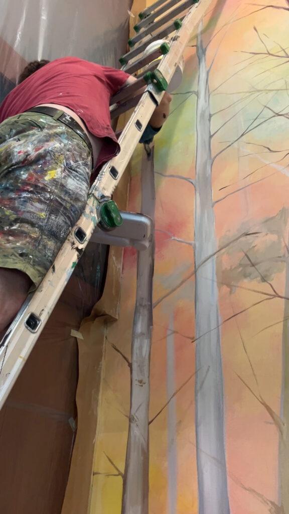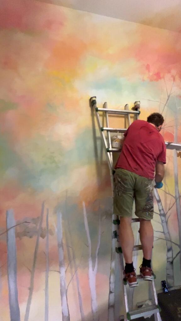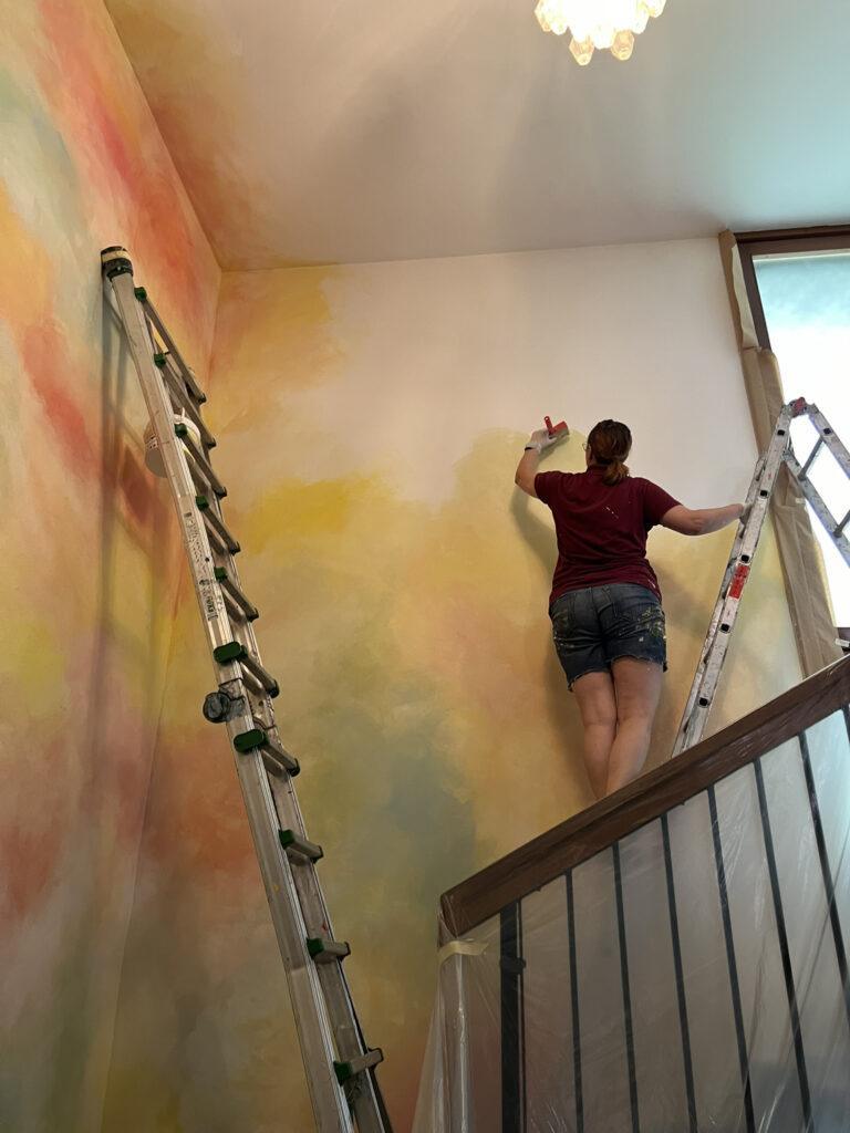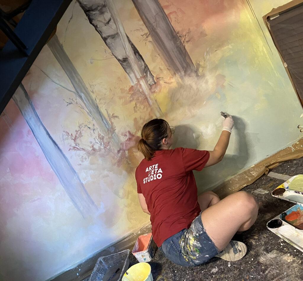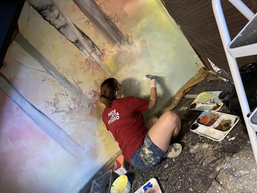 La principale difficoltà di lavorare in un vano scala è garantire l’accessibilità durante i lavori, poiché la scala rappresenta l’unico collegamento con il piano superiore. Per superare questo ostacolo, si è optato per l’uso di scale molto alte, evitando l’installazione di un’impalcatura, così da assicurare la fruibilità continua dello spazio per i clienti. L’effetto acquerello è stato ottenuto attraverso sovrapposizioni di velature di colori diluiti, che donano profondità e luminosità al murale.