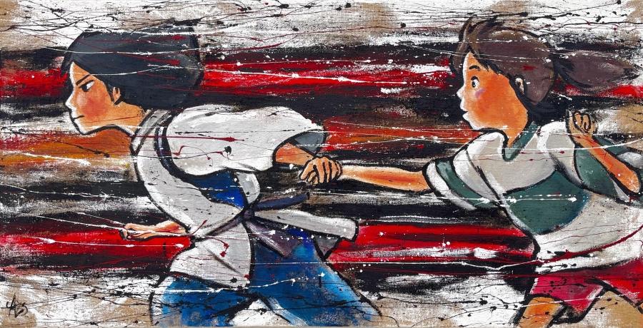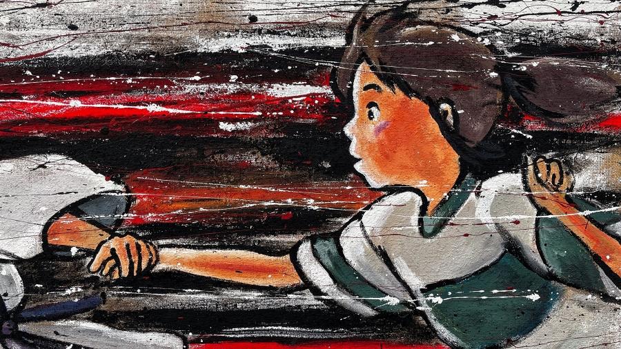 Il capolavoro di Hayao Miyazaki è tra i più conosciuti e amati della sua intera carriera, per questo Arte Zeta Studio ha voluto omaggiare l’opera ritraendo una delle scene di fuga più iconiche. La dinamicità nell’immagine è palpabile, grazie al sapiente uso delle linee cinetiche ottenute con schizzi di colore e una magistrale combinazione di rosso e nero per lo sfondo. Tutte le nostre opere sono realizzate artigianalmente e possono essere personalizzate su richiesta, sia nelle dimensioni che nei dettagli pittorici. Contattaci per creare un quadro su misura per te.