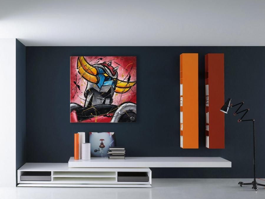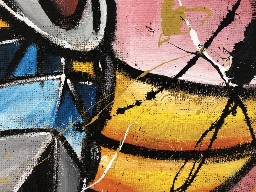 La pittura su juta, veloce, materica, d’impatto, esplode sulle pareti delle case di ogni nostalgico. Gli schizzi di colore come tocco finale portano i bidimensionali cartoni animati su un piano diverso, quello pittorico.