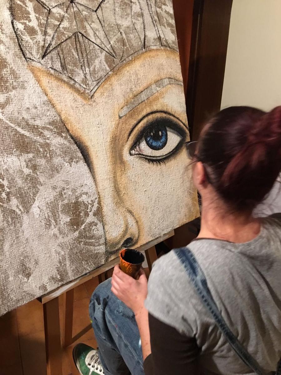 Il quadro rappresenta la bella eroina in primo piano con metà viso nascosto dai suoi scuri e fluenti capelli. Lo stile è pittorico e in alcuni punti il colore non è coprente così da lasciare intravedere la juta, materiale con cui è realizzata la tela. I tempi di realizzazione del prodotto si aggirano intorno ai 7 giorni lavorativi.