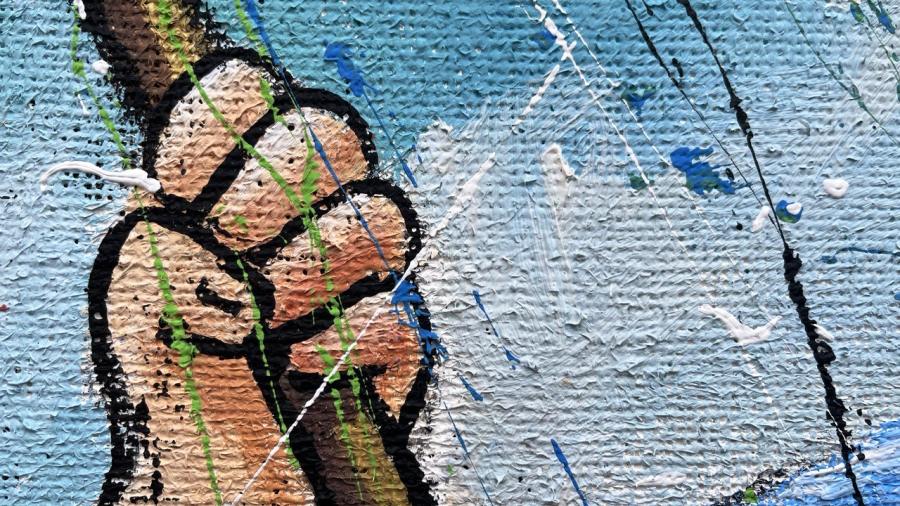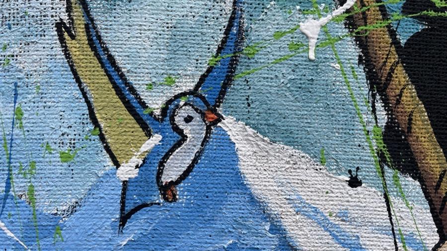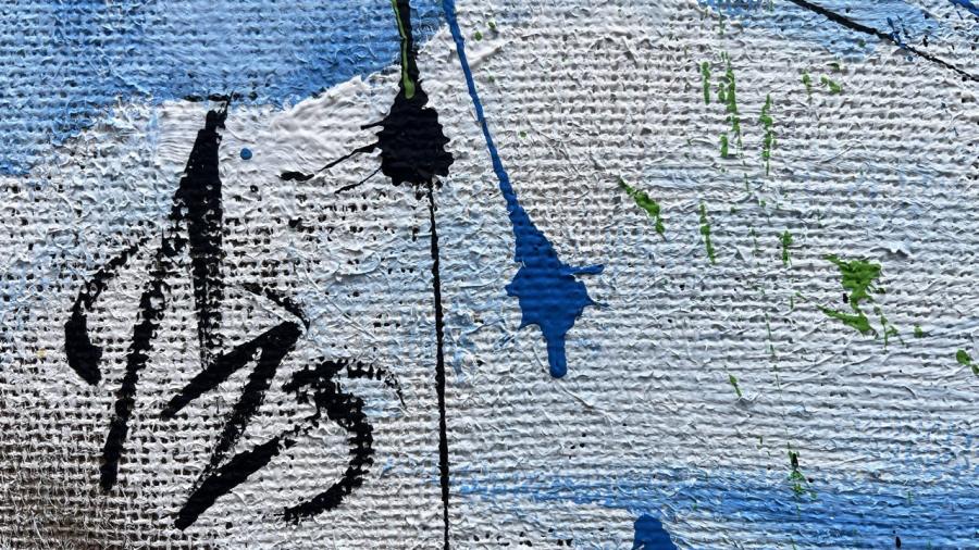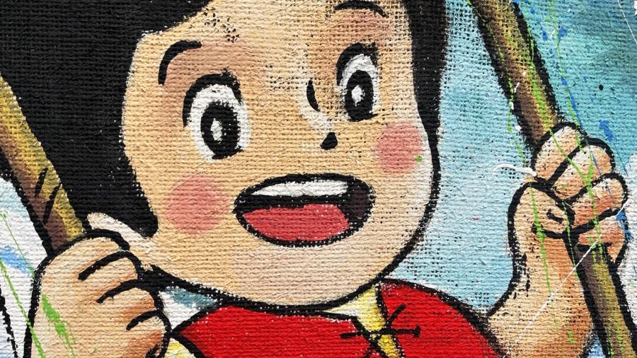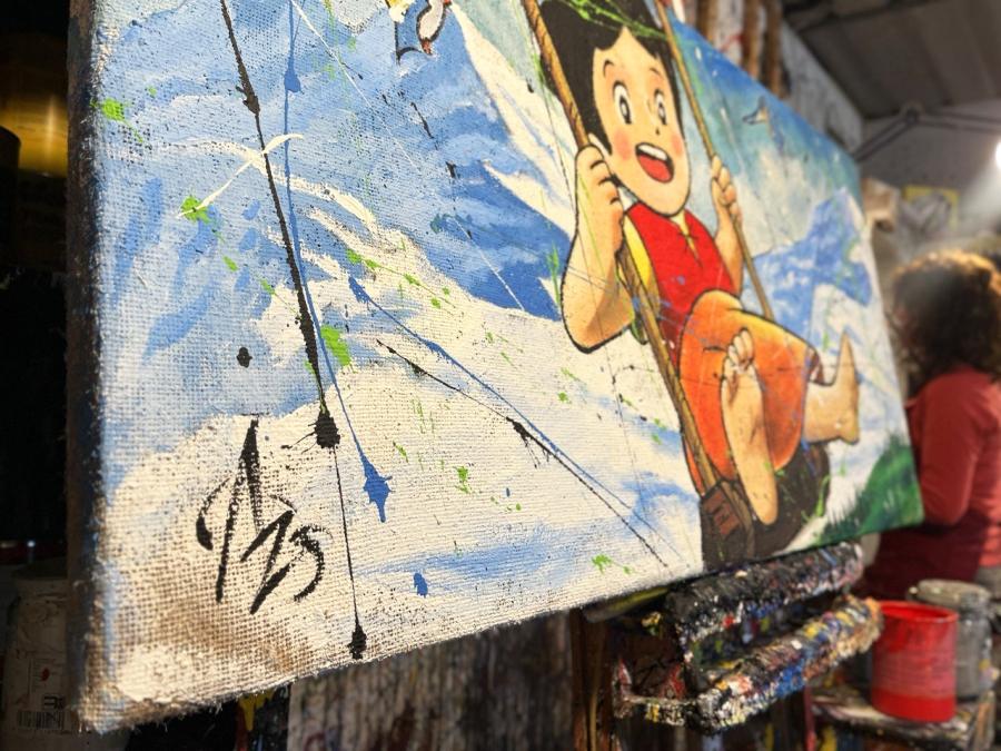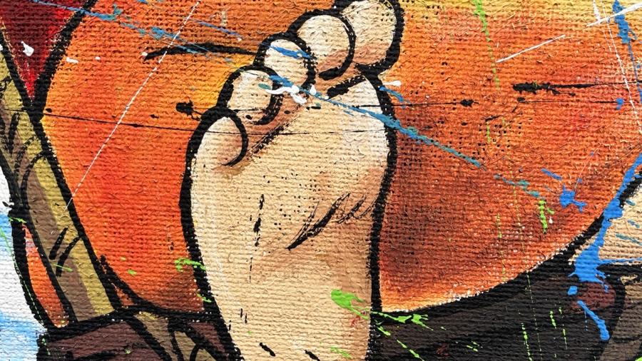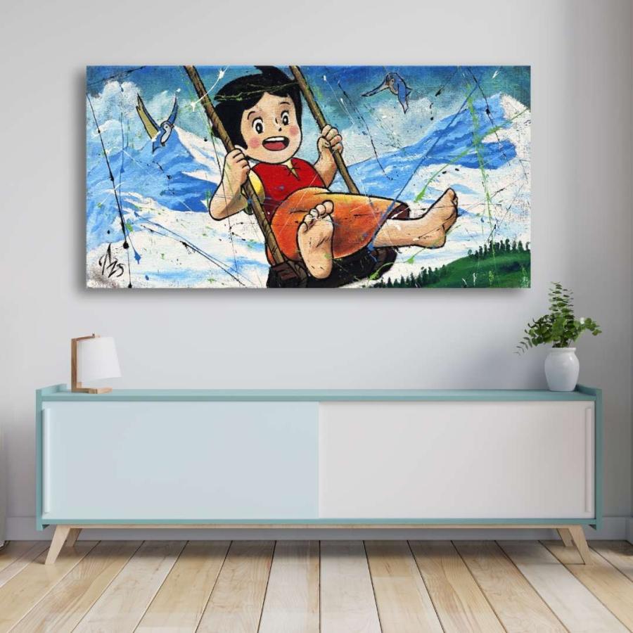 Lo sfondo è dominato da un cielo blu brillante con nuvole bianche e montagne maestose, mentre in lontananza si può scorgere una linea di abeti verdi che definisce l’orizzonte. Alcuni uccelli blu volano nel cielo, aggiungendo movimento alla scena. Lo stile artistico combina elementi del manga originale con tecniche di street art, evidenti negli schizzi di vernice blu e verde che attraversano la tela. L’espressione gioiosa di Heidi e i suoi piedi nudi oscillanti trasmettono perfettamente il suo amore per la libertà e la natura.
