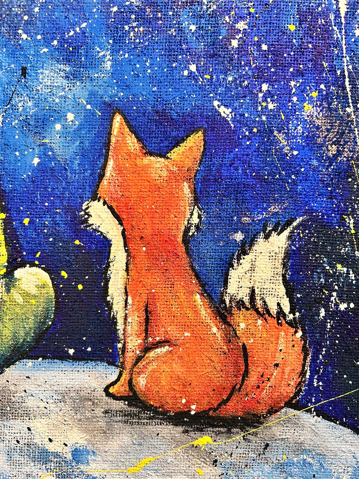 DESCRIZIONE: Ispirato alla poesia senza tempo de Il Piccolo Principe, questo quadro su tela dipinto a mano realizzato da Arte Zeta Studio raffigura il protagonista insieme alla sua inseparabile volpe, seduti sulla luna mentre osservano il sole all’orizzonte. La scena, vista di spalle, invita chi guarda a entrare direttamente nel quadro. La composizione è essenziale ma evocativa: le figure sono raccolte in una dimensione sospesa, dove la luna diventa uno spazio simbolico e il sole un punto di luce che guida lo sguardo. I contrasti cromatici e le pennellate materiche insieme agli schizzi di colore donano profondità all’opera.