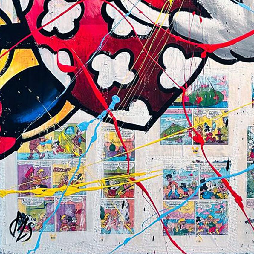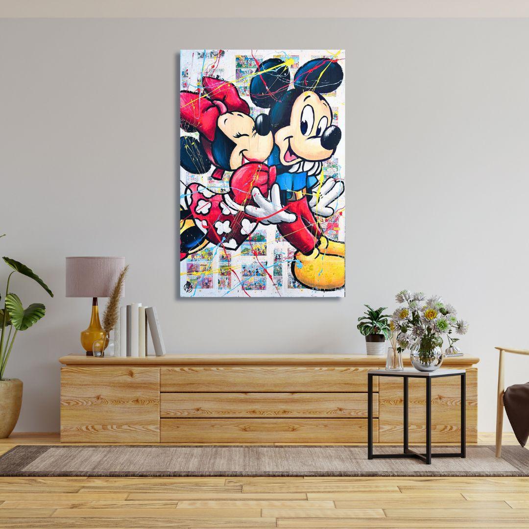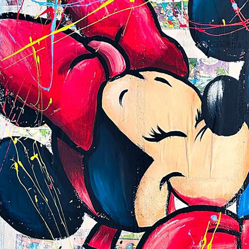 DESCRIZIONE: Questo quadro artigianale realizzato dal nostro laboratorio rappresenta Minnie e Topolino in un momento spontaneo e affettuoso: lei lo sorprende con un abbraccio. La vera particolarità del dipinto è lo sfondo, realizzato a mano con pagine originali di fumetti vintage, applicate una ad una per creare una base ricca di dettagli e significato. Su questo fondo prende forma il soggetto, dipinto con colori acrilici intensi e arricchito da schizzi e segni gestuali che donano energia e contemporaneità all’opera.